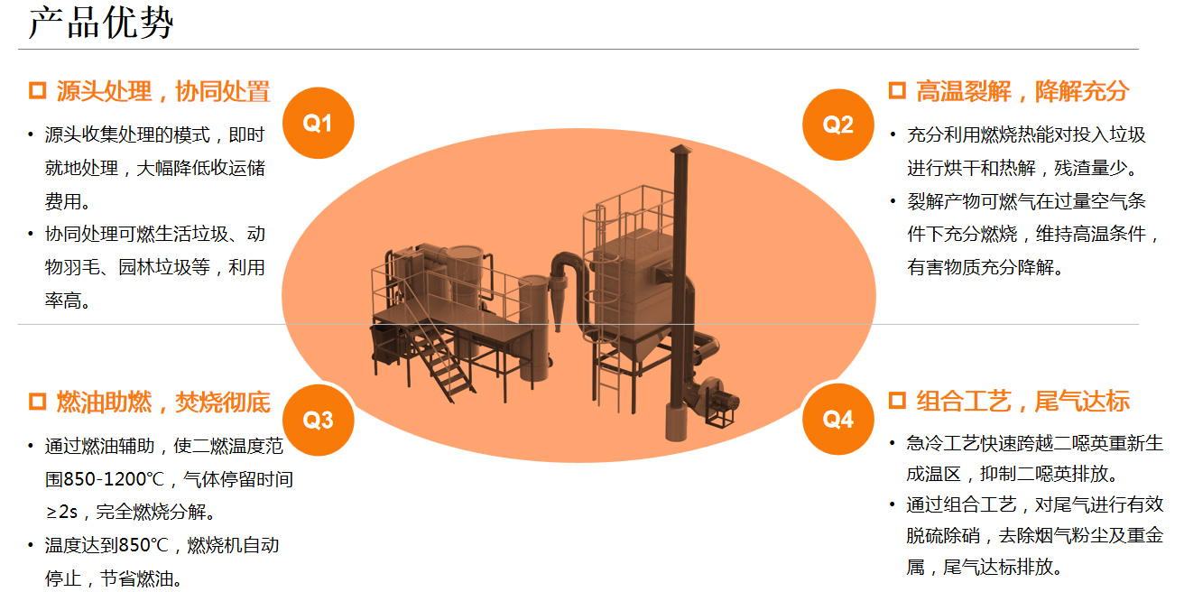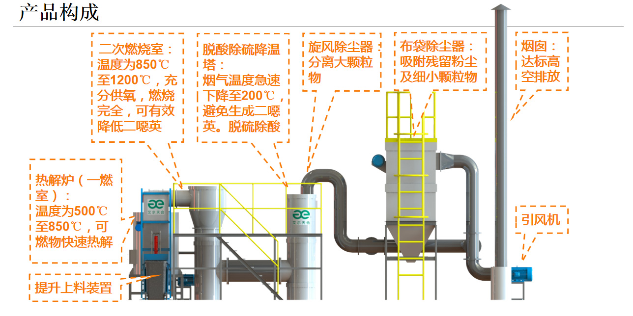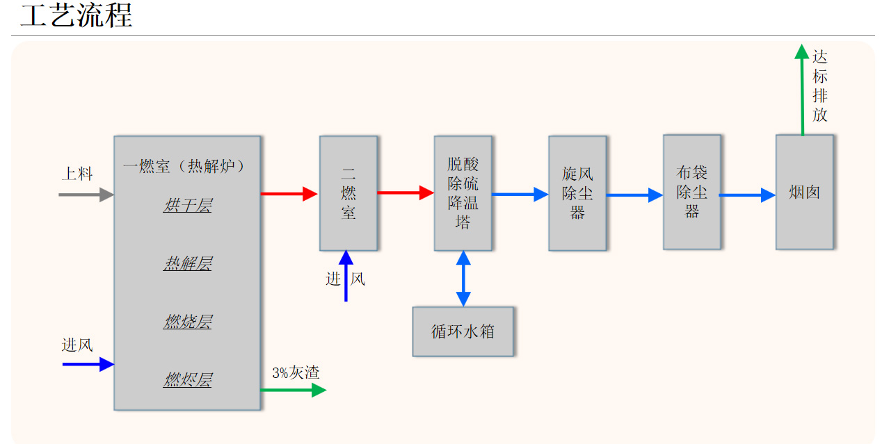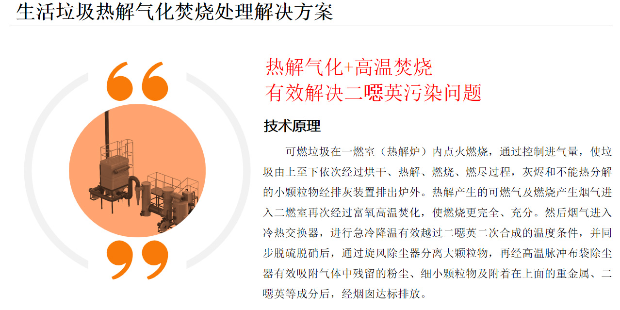 1.熱解氣化焚燒系統針對我國垃圾的特點,實現了垃圾先熱解氣化、后富氧燃燒的二段式燃燒處理工藝。該技術在國內是一種較為安全、經濟的垃圾處理技術。2.由于熱解氣化的二燃室燒的是氣體,過量空氣系數較小,所以熱解法產生的煙氣量比直接焚燒法少,有利于煙氣的凈化,降低了二次污染的排放及治理成本。3.熱解氣化過程在低氧條件下進行,減少了二噁英前驅體的生成,二燃室內的溫度高達1100℃左右,且煙氣停留時間超過2s,可迅速分解二噁英類物質,使煙氣中的有害成分降低至國家排放標準規定值以下。4.系統煙氣凈化采用半干法脫硫吸附除塵工藝,煙氣處理效果好,不產生二次污染。