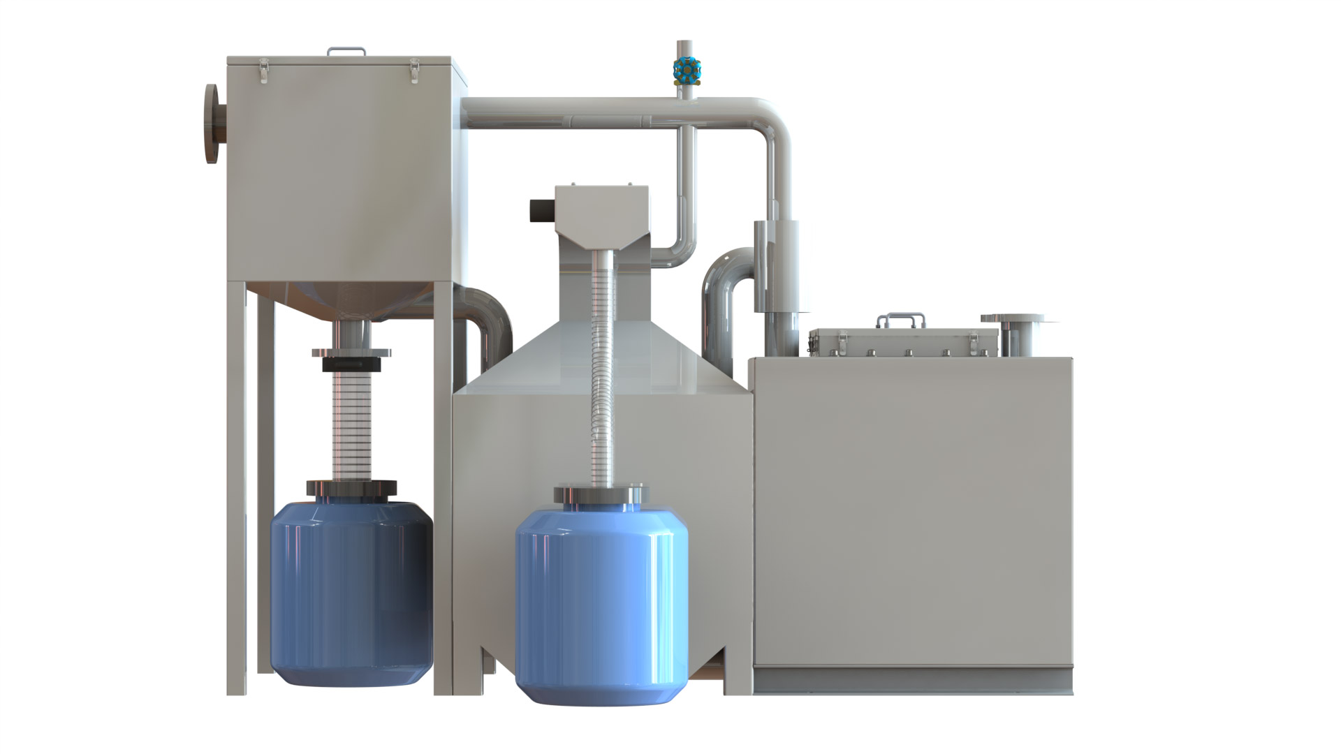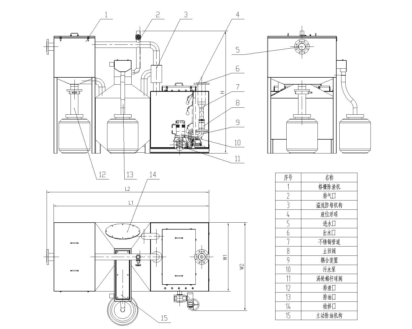 ①固液分離倉 : 設有過濾柵除,定期人工手動打開排渣閥放渣進入集渣桶中,周圍設計了密閉式,有效的防止了污水自由下落時建起水花,同時隔絕了異味。