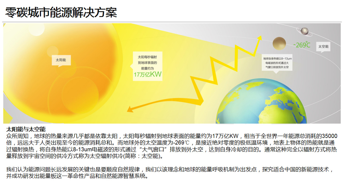 眾所周知,地球的熱量來(lái)源幾乎都是依靠太陽(yáng),太陽(yáng)每秒輻射到地球表面的能量約為17萬(wàn)億KW,相當(dāng)于全世界一年能源總消耗的35000倍,遠(yuǎn)遠(yuǎn)大于人類出現(xiàn)至今的能源消耗總和。而地球外的太空溫度為-269℃,是接近絕對(duì)零度的極低溫環(huán)境,地表上物體的熱能就是通過(guò)輻射換熱,將自身熱能以8-13um電磁波的形式通過(guò)“大氣窗口”排放到外太空,達(dá)到自身冷卻的目的。通常這種完全以輻射方式將熱量釋放到宇宙空間的供冷方式稱為太空輻射供冷(簡(jiǎn)稱:太空能)。